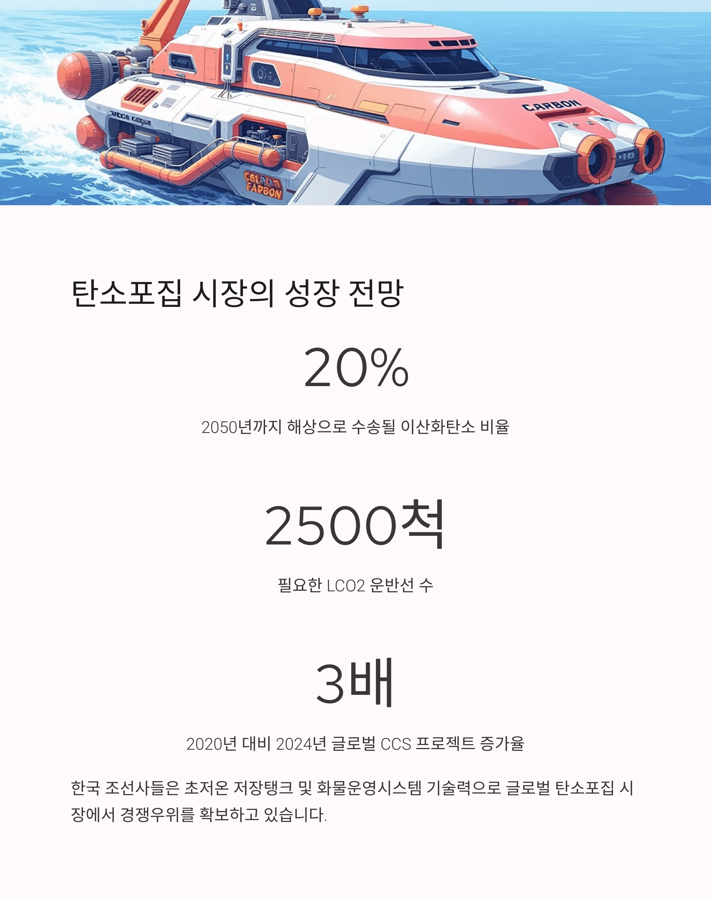 또한 글로벌 CCS 프로젝트 수는 2020년 65건에서 2024년 196건으로 세 배 증가했으며, 이 중 상당수가 해상 수송과 저장을 병행하는 형태로 진행되고 있습니다. 이는 조선업계에 LNG 운반선 시장에 버금가는 새로운 시장을 열어줄 것으로 전망됩니다.