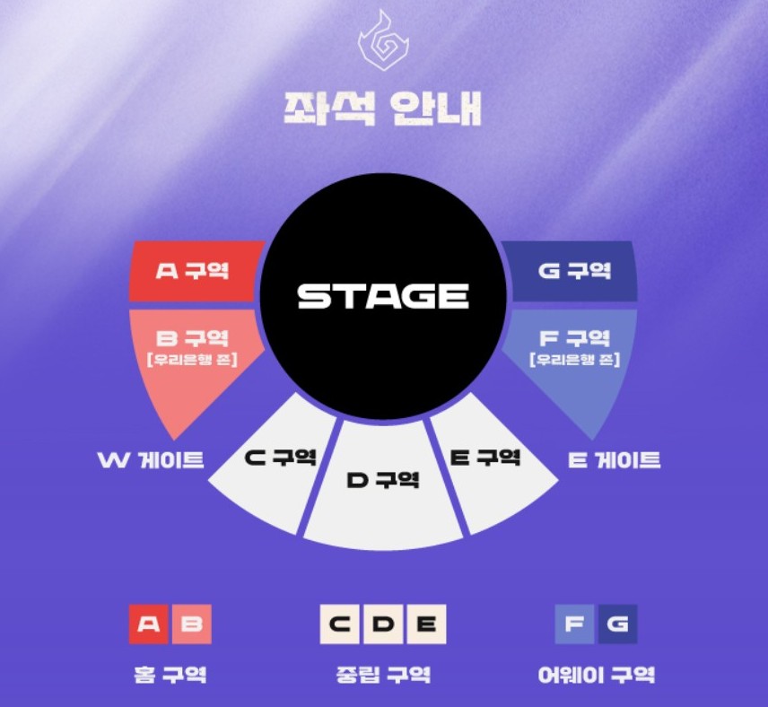 A구역은 전용 응원석, CE 구역은 일반석, B/F구역은 우리은행존으로 구분되어 있습니다. 무대(STAGE)를 중심으로 반원형으로 구성되어 있습니다.