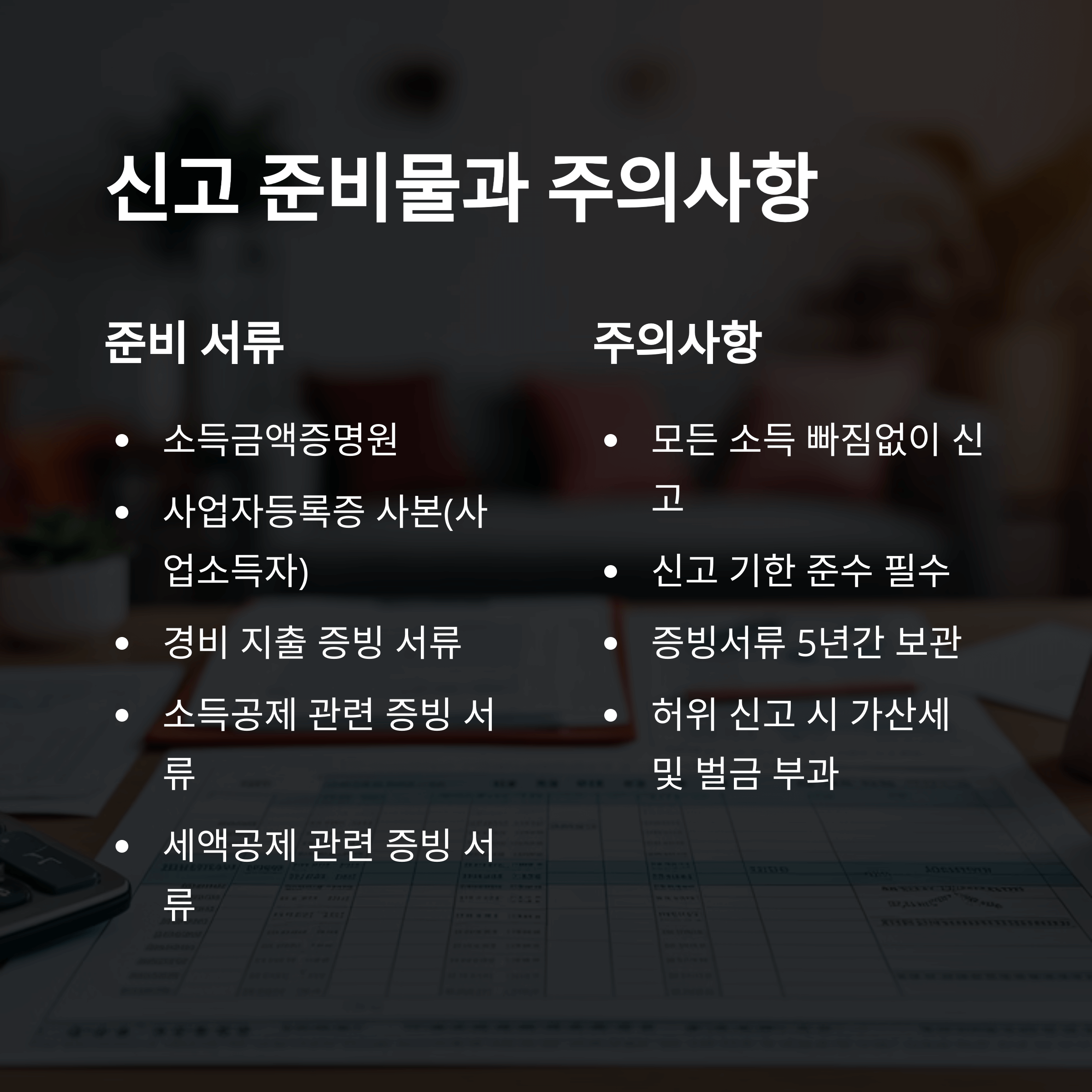 - 종합소득세 신고 기한을 반드시 지켜야 합니다.