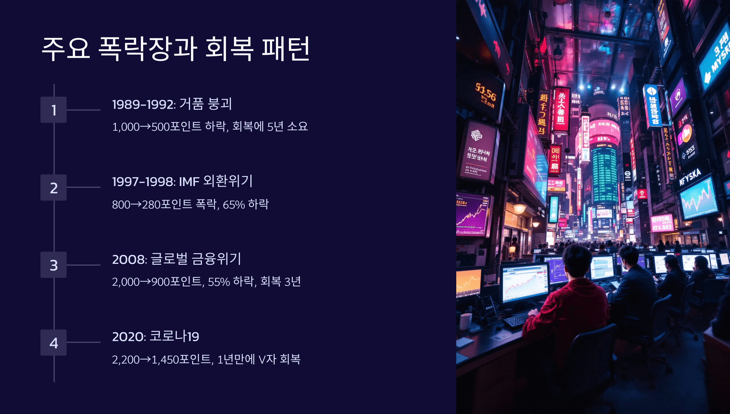한국 주식시장은 짧은 역사 속에서도 여러 차례의 중대한 폭락과 회복을 경험했다. KOSPI 지수가 공식 출범한 1983년 이후 한국 시장은 국내외 금융위기, 정치적 격변, 글로벌 충격 등으로 인한 급격한 변동을 겪었다.